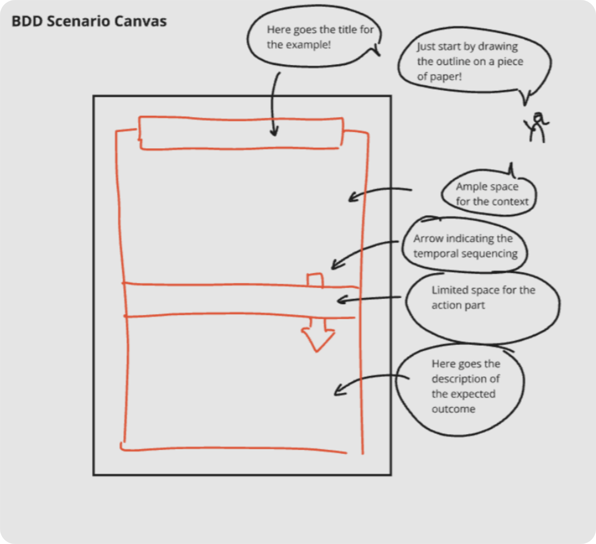 Em reuniões com stakeholders, um facilitador ou um praticante experiente de BDD pode registrar os detalhes rapidamente nas seções correspondentes do canvas, à medida que a conversa avança.